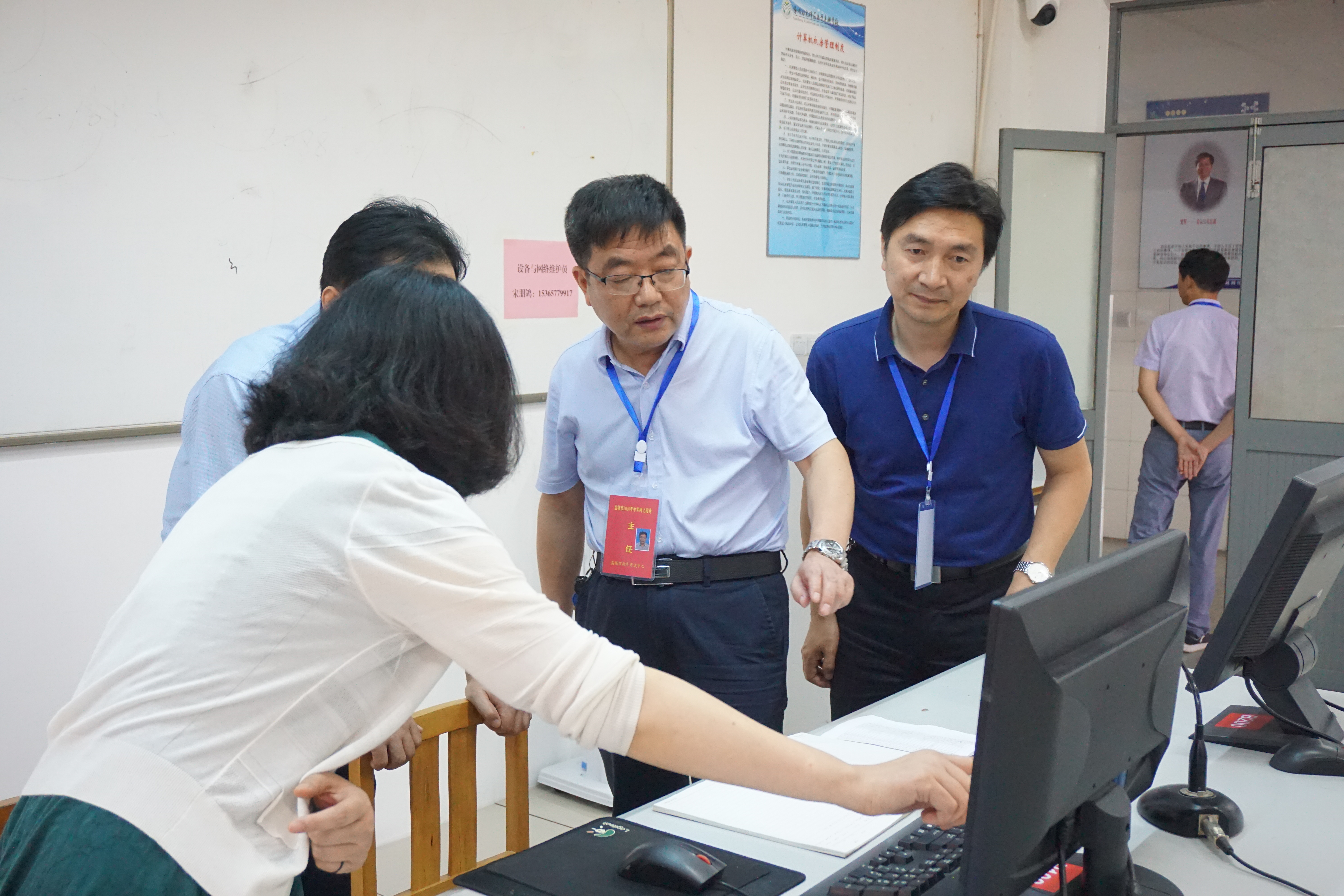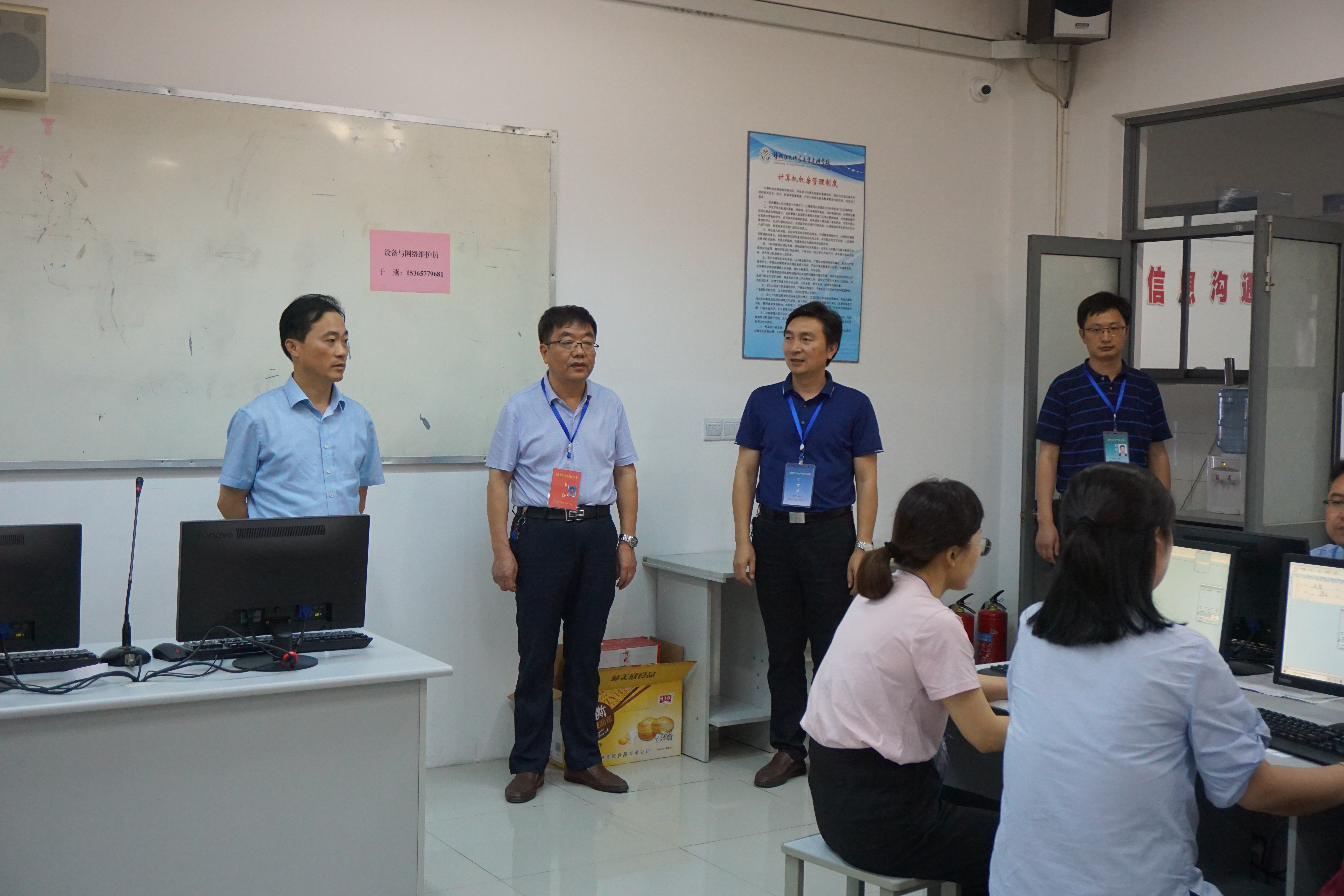 在6月底,接到阅卷工作通知以后,我校立刻组织各职能部门召开会议,强调要按照“严格防控、组织顺畅、优质高效、服务满意”的标准进行布置安全保卫、后勤保障、设备调试等各项工作,落实进门、进楼两道测温,精心调试每一台机器和设备,联系供电局派电力保障车,卫生消杀等工作。崔霞副校长在阅卷工作前的7月17日还走进各准备的培训会议室、机房一一检查准备工作,并进一步提出要求。