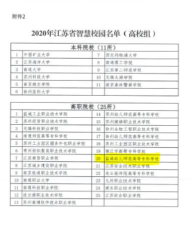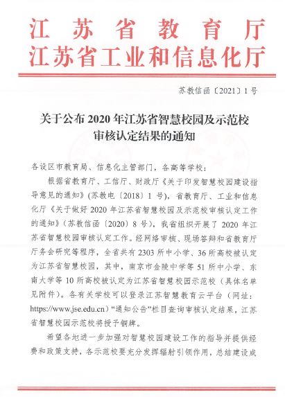 2021年1月,我校被江苏省教育厅、江苏省工业和信息化厅联合审核评定为江苏省智慧校园,这是我校进入新发展时期的一项重要成绩。近年来,我校信息化建设实现了巨大的飞跃,信息化体系形成基本框架,信息化设施有序添置,信息化应用逐渐丰富,信息化创新结出硕果。